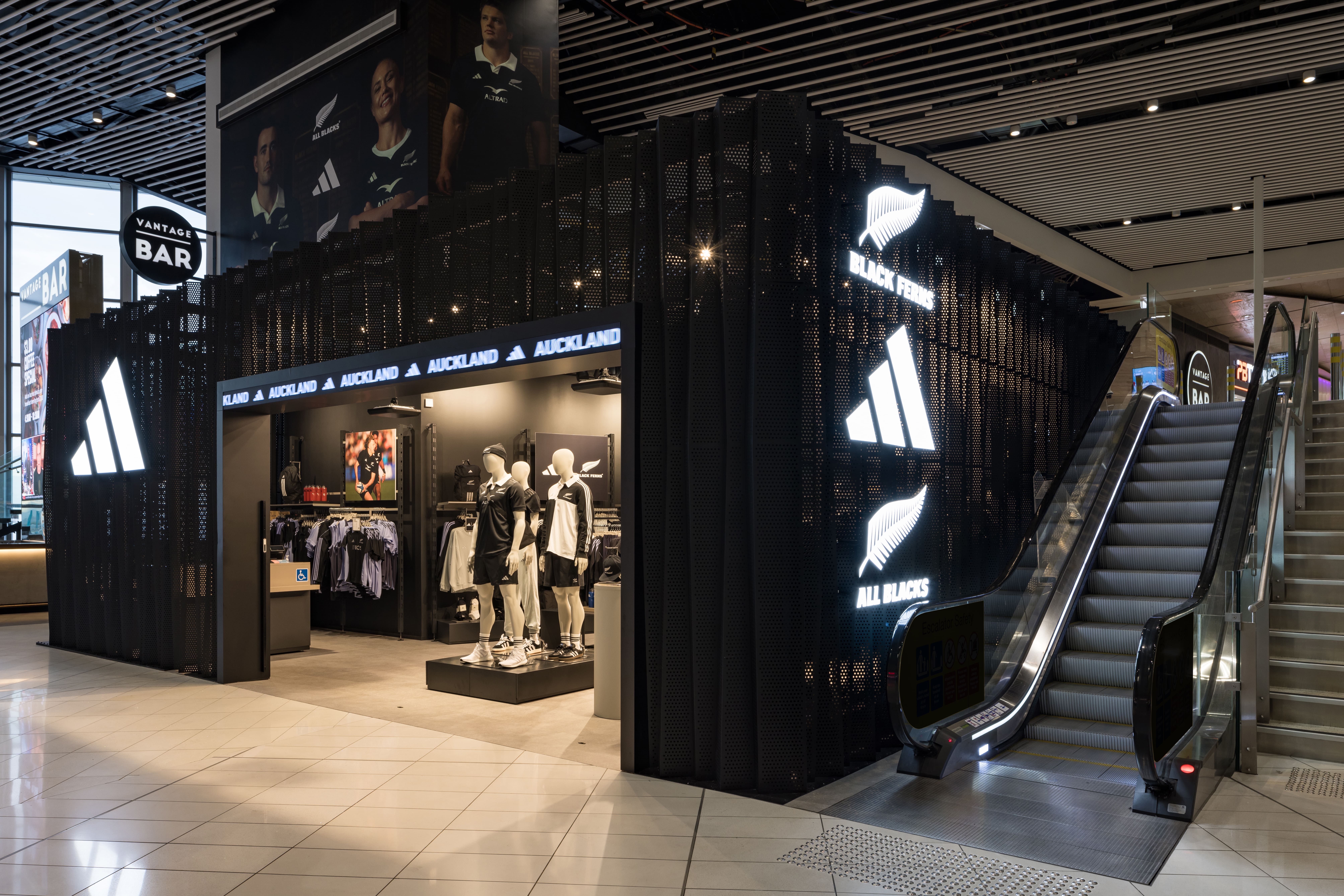 Located airside at the Auckland International Airport, the site presented unique challenges due to complex service requirements and an intricate shopfront design. The striking black faceted perforated metal shopfront was manufactured abroad, and shipped to New Zealand for installation by the contractor, Dimension Shopfitters.